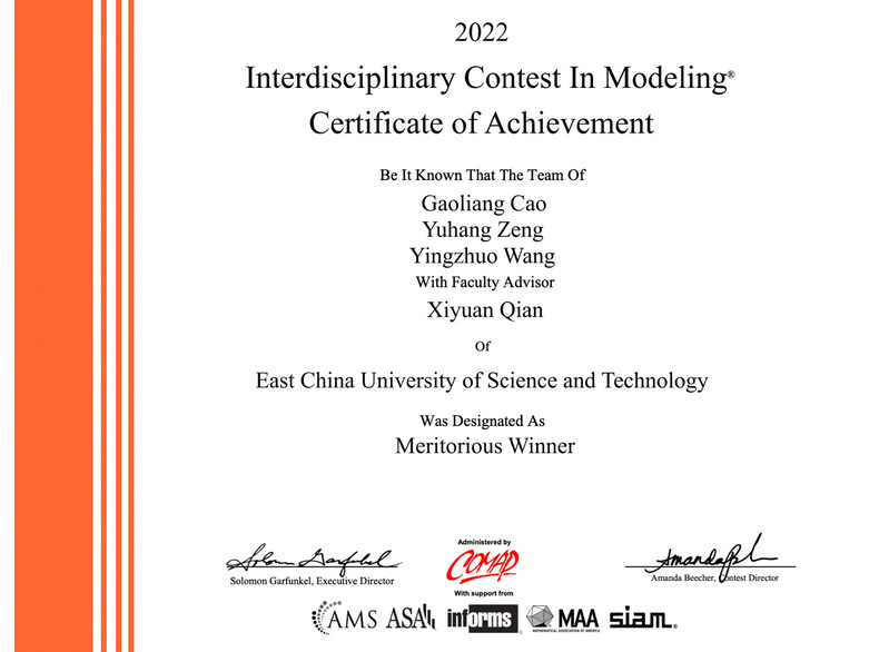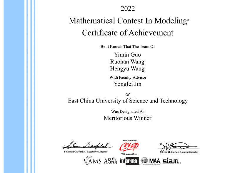 靳勇飞老师指导的信息学院2019级本科生郭懿敏、王若菡、中德工学院王恒煜团队获得一等奖(Meritorious Winner)。此外,我校还有6支参赛团队获得二等奖(Honorable Mention)。